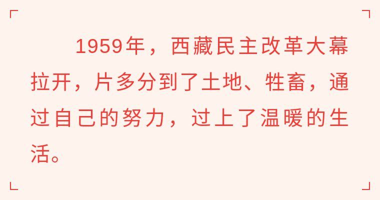在舊西藏,片多是當(dāng)?shù)厍f園的農(nóng)奴。她回憶,那時(shí)的生活太艱苦,農(nóng)奴的衣服破舊不堪,滿是補(bǔ)丁,有時(shí)候連打補(bǔ)丁的布料也沒(méi)有。到了冬天,沒(méi)有被褥,只能靠生火御寒,要等白天出太陽(yáng)才稍微暖和一點(diǎn)。