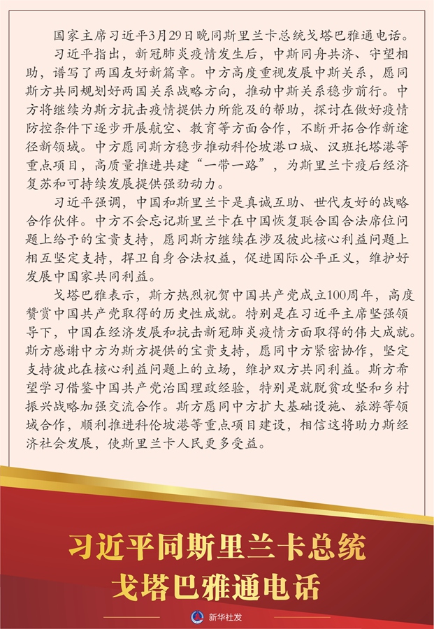 新華社北京3月29日電 國(guó)家主席習(xí)近平3月29日晚同斯里蘭卡總統(tǒng)戈塔巴雅通電話。