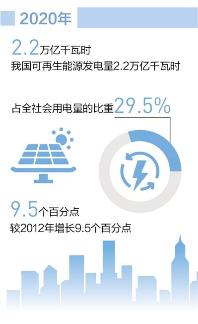 “近年來(lái),我國(guó)可再生能源實(shí)現(xiàn)跨越式發(fā)展,開(kāi)發(fā)利用規(guī)模穩(wěn)居世界第一!眹(guó)家能源局局長(zhǎng)章建華30日表示,截至2020年底,我國(guó)可再生能源發(fā)電裝機(jī)總規(guī)模達(dá)到9.3億千瓦,占總裝機(jī)的比重達(dá)到42.4%,較2012年增長(zhǎng)14.6個(gè)百分點(diǎn);2020年,可再生能源發(fā)電量達(dá)到2.2萬(wàn)億千瓦時(shí),占全社會(huì)用電量的比重達(dá)到29.5%,較2012年增長(zhǎng)9.5個(gè)百分點(diǎn)。