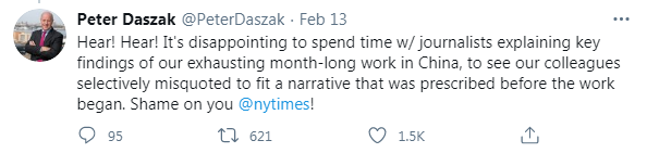 美國專家彼得·達(dá)薩克博士在社交媒體上駁斥《紐約時(shí)報(bào)》的報(bào)道。圖為截屏