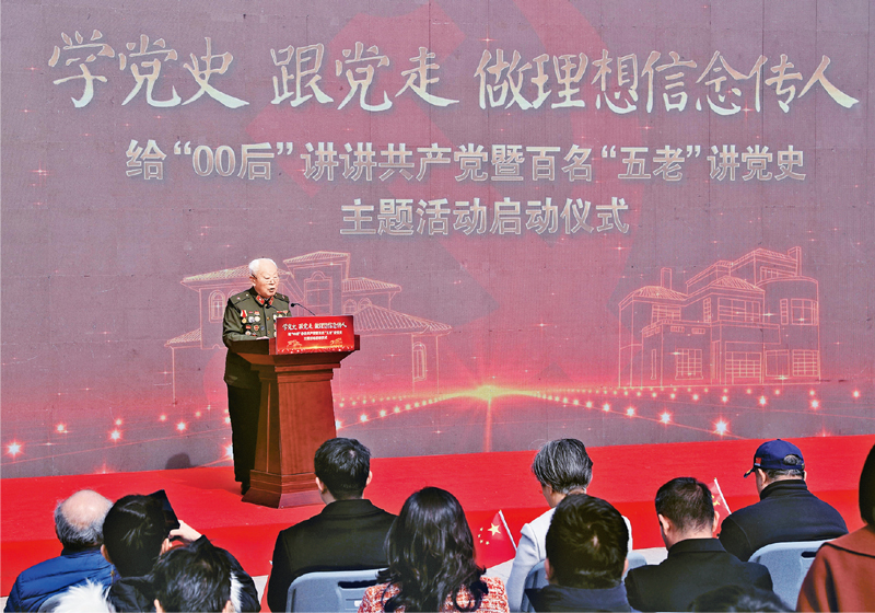 2021年2月23日,“學黨史 跟黨走 做理想信念傳人——給‘00后’講講共產(chǎn)黨暨百名‘五老’講黨史主題活動”在位于上海市嘉定區(qū)的外岡游擊隊紀念館正式啟動。本次活動拉開了上海教育系統(tǒng)黨史學習教育的序幕,將組織包括新四軍老戰(zhàn)士在內(nèi)的一批老干部、老戰(zhàn)士、老專家、老教師、老模范走進校園,以“校外輔導員”的方式,參與大學和中小學的思想政治教育,教育引導青少年始終聽黨的話、永遠跟黨走。圖為上海市新四軍歷史研究會名譽會長、九旬新四軍老戰(zhàn)士阮武昌在活動現(xiàn)場講述新四軍的抗日故事。 新華社記者 劉穎/攝