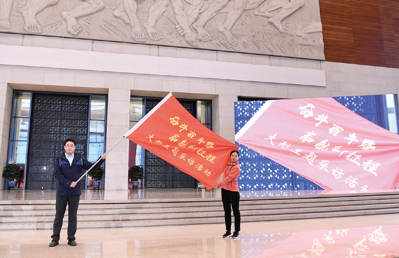 2021年1月18日,中宣部在國(guó)家博物館舉行“奮斗百年路 啟航新征程”大型主題采訪活動(dòng)啟動(dòng)儀式。中央和地方主要媒體的編輯記者代表在北京主會(huì)場(chǎng)和各省區(qū)市分會(huì)場(chǎng)參加啟動(dòng)儀式。圖為記者代表展示“奮斗百年路 啟航新征程”大型主題采訪活動(dòng)旗幟。 新華社記者 申宏/攝