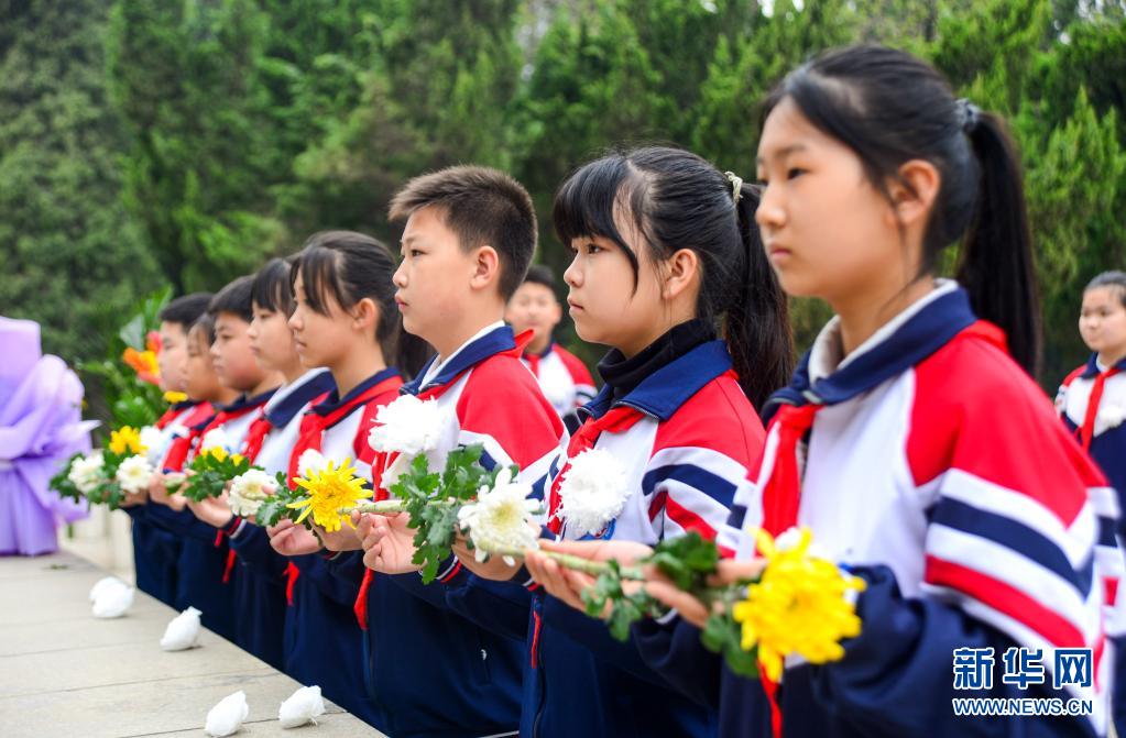 4月1日,在晉冀魯豫烈士陵園,邯鄲市邯山區(qū)農林路小學學生向烈士公墓獻花。