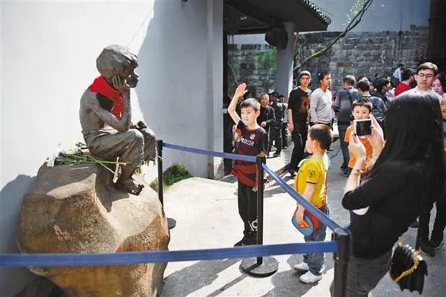 白公館景區(qū),一名孩子向小蘿卜頭雕像敬禮。首席記者 謝智強 攝 圖:新華網(wǎng)