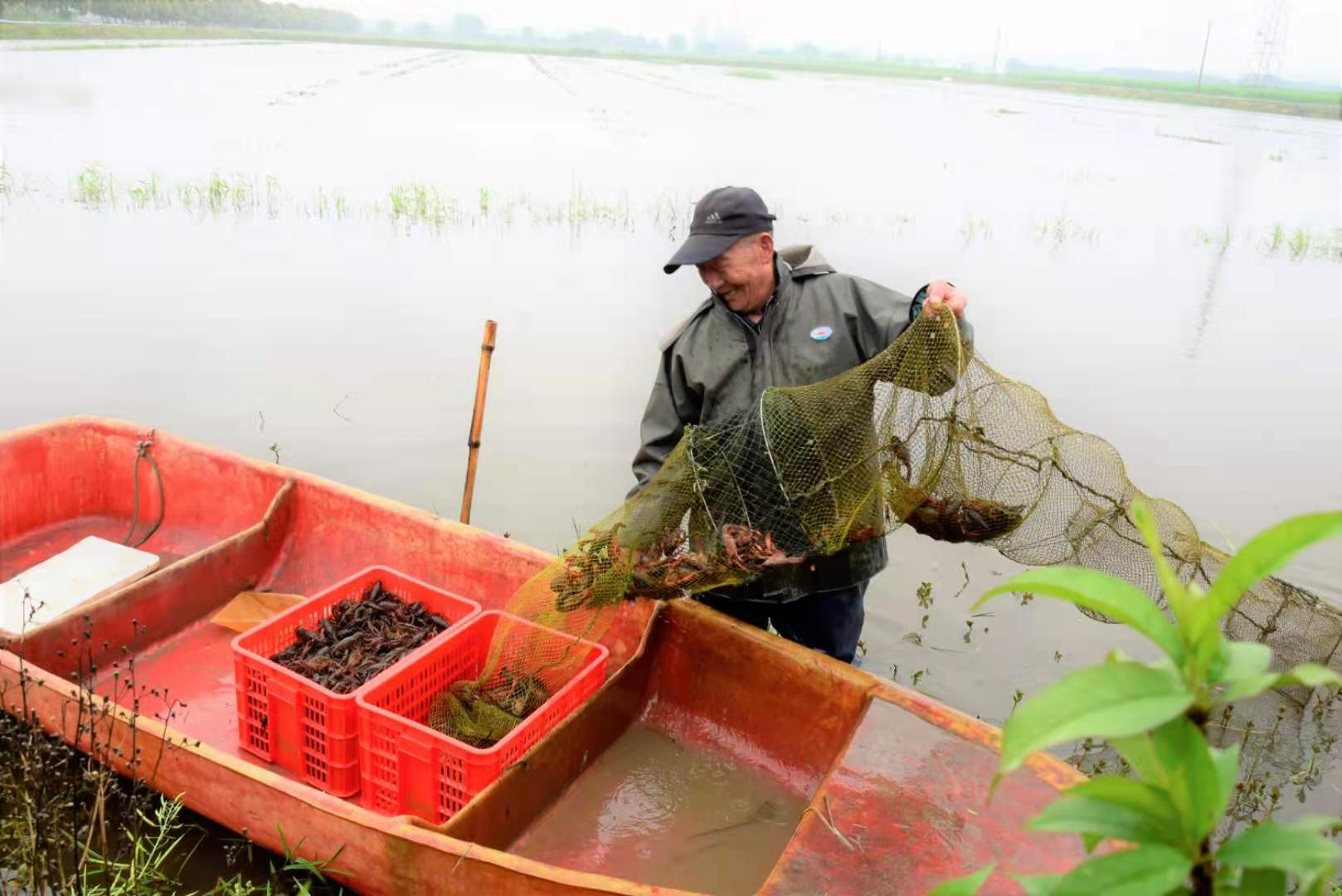 圖為:正在捕撈小龍蝦的蝦農(nóng)