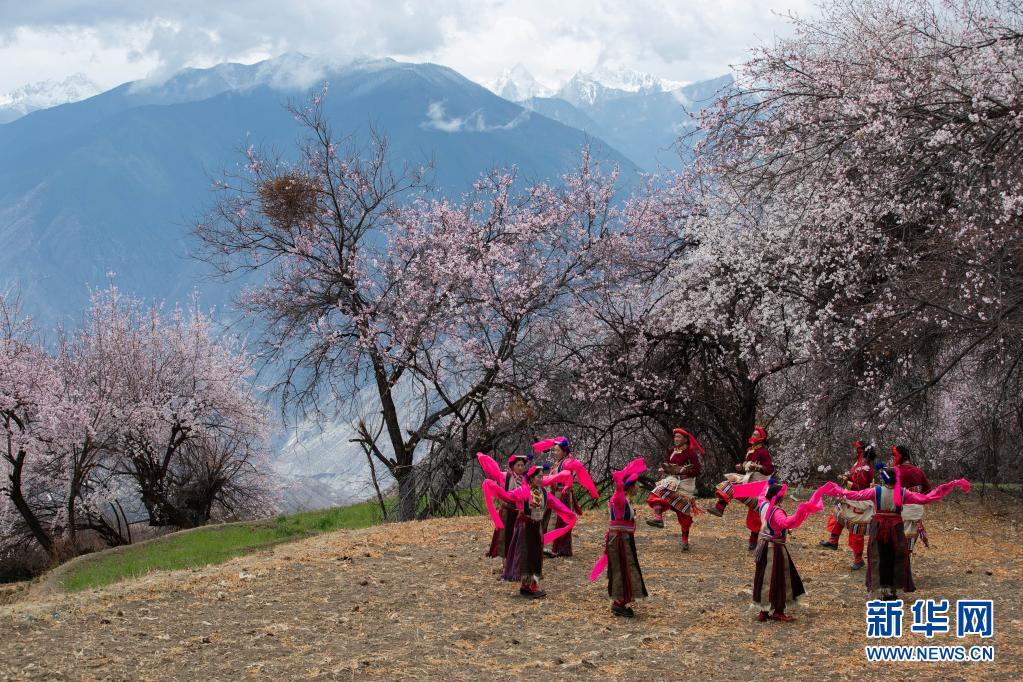 4月4日,在得榮縣徐龍鄉(xiāng)徐堆村,藏區(qū)群眾在桃花林下表演當(dāng)?shù)馗栉琛X央彈唱。