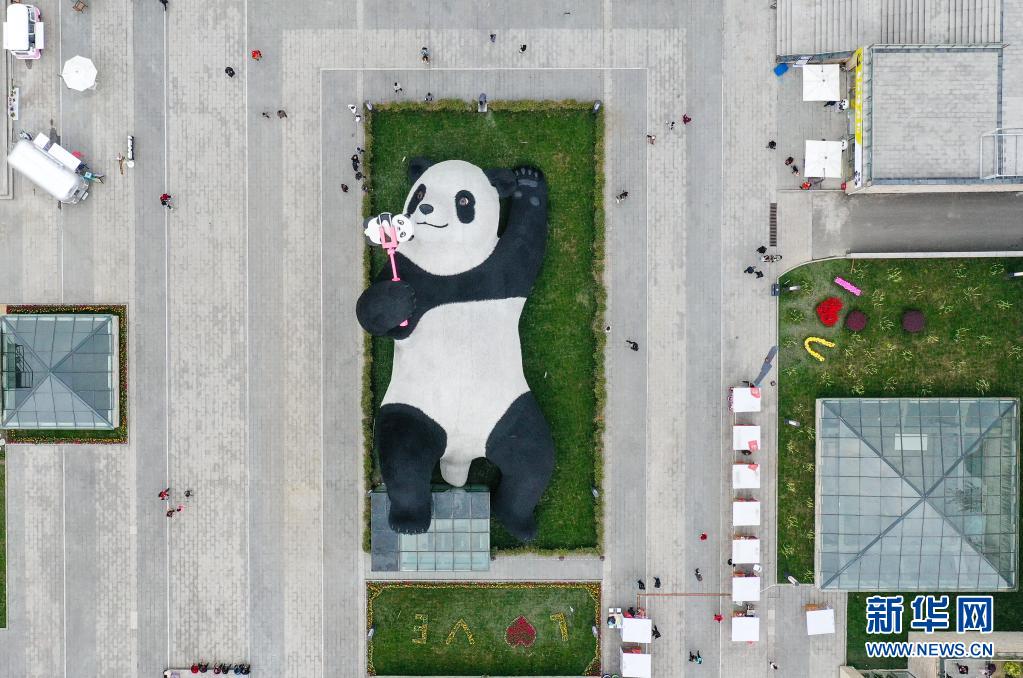 這是4月7日在四川省都江堰市仰天窩廣場拍攝的“自拍熊貓”雕塑(無人機照片)。