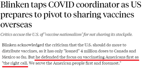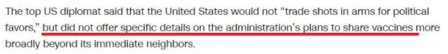 用布林肯的話說,現(xiàn)在是時候確保更多人在國外受到保護了,因為其他國家正“越來越絕望”地要求美國分享疫苗。只是除了表示“我們會盡快行動”,布林肯什么也沒說。