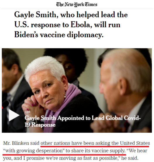 或許是在這樣一個時刻突然“良心發(fā)現(xiàn)”,一直攻擊他國搞“疫苗外交”的美國居然自己也要搞了:當?shù)貢r間5日,美國國務院任命公共衛(wèi)生專家蓋爾·史密斯為“全球新冠疫情應對及衛(wèi)生安全協(xié)調(diào)員”,就新冠疫苗展開外交工作。