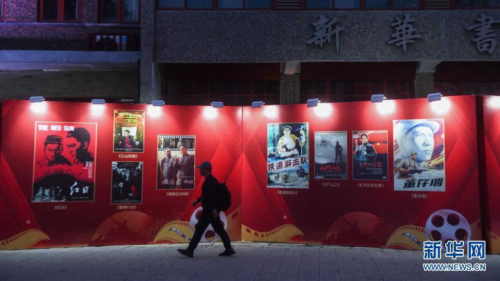 2021年4月2日拍攝的瓶窯古鎮(zhèn)老街上展示的經(jīng)典電影海報。當日,浙江省杭州市余杭區(qū)瓶窯古鎮(zhèn)開啟慶建黨百年經(jīng)典電影展映活動。