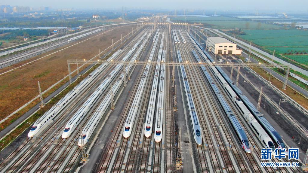 4月10日拍攝的江蘇省南通市南通動車所存車線上排列的動車組(無人機照片)。4月10日零時起,全國鐵路實行新的列車運行圖。新華社發(fā)(許叢軍 攝)