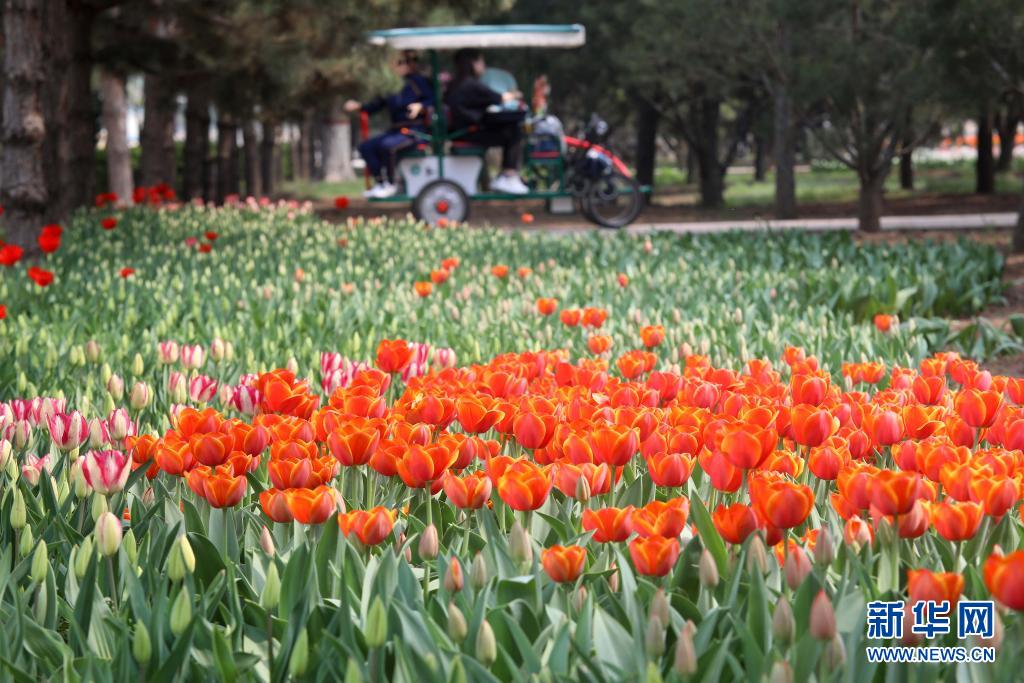 4月8日,游客在石家莊市植物園欣賞郁金香。