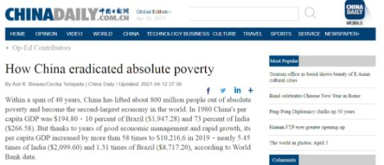 近日,英國格拉斯哥大學(xué)杰出訪問教授阿西特 比斯瓦斯(Asit K. Biswas)、跨學(xué)科研究學(xué)院教授塞西莉亞 托塔哈達(dá)(Cecilia Tortajada)在《中國日?qǐng)?bào)》發(fā)表文章總結(jié)了中國脫貧奇跡的六大密碼,認(rèn)為堅(jiān)強(qiáng)領(lǐng)導(dǎo)是中國減貧“密碼”的關(guān)鍵所在。