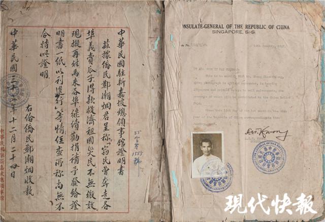 △ 1947 年中華駐新加坡總領(lǐng)事館頒發(fā)給鄭潮炯 " 義賣瓜子救濟(jì)祖國災(zāi)民 " 的中西文證明書