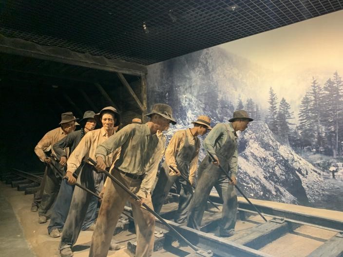 江門五邑華僑華人博物館展出的美國(guó)華工群像雕塑。人民日?qǐng)?bào)記者 吳姍攝