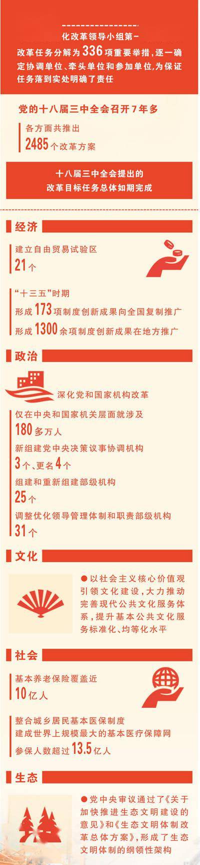 翻開這份決定,從以經(jīng)濟(jì)體制改革為主到全面深化經(jīng)濟(jì)、政治、文化、社會(huì)、生態(tài)文明體制和黨的建設(shè)制度改革,是新中國(guó)成立以來(lái)最為全面系統(tǒng)的改革部署。