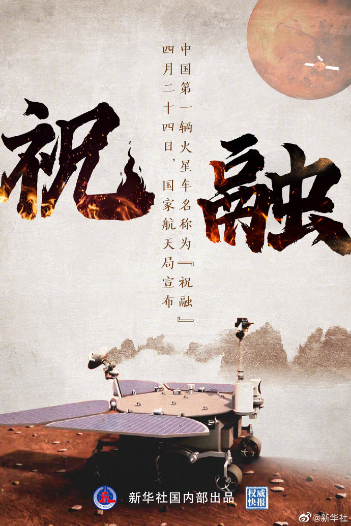 4月24日上午,中國第一輛火星車命名揭曉,名稱為“祝融”。祝融是中國上古神話中的火神,火的應(yīng)用促進(jìn)了人類文明的發(fā)展,驅(qū)散黑暗、帶來溫暖;鹨矊⒄樟柳櫭桑敢祟惒粩嗵剿骱棋强,引領(lǐng)人類追逐“永遠(yuǎn)的光明”。
