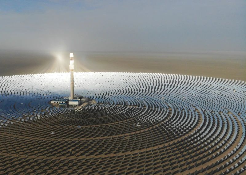 △我國(guó)加快發(fā)展新能源和可再生能源,能源消費(fèi)結(jié)構(gòu)不斷優(yōu)化,能源綠色低碳轉(zhuǎn)型深入推進(jìn),清潔能源消費(fèi)比重持續(xù)提高,可再生能源裝機(jī)快速增長(zhǎng)。圖為被稱為“超級(jí)鏡子發(fā)電站”的首航高科敦煌100兆瓦熔鹽塔式光熱電站在戈壁灘上閃耀。