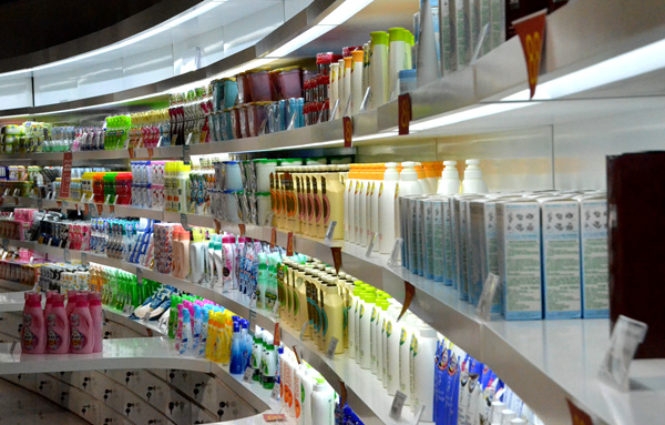 西海岸新區(qū)中日韓消費專區(qū)體驗中心里琳瑯滿目的免稅產(chǎn)品。人民網(wǎng)記者 孫博洋攝