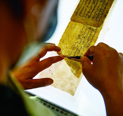 西藏古籍保護中心的工作人員修復(fù)珍貴藏文瀕危古籍文獻。新華社發(fā)