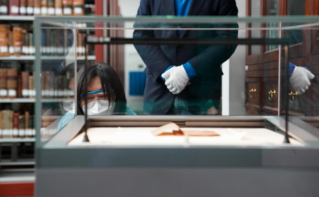 在上海社會(huì)科學(xué)院圖書(shū)館特藏室,古籍修復(fù)師成雯吉從高氣密性恒溫恒濕展柜中取出《共產(chǎn)黨宣言》中文全譯本。