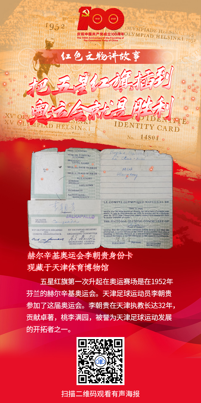 本期有聲海報(bào)聚焦天津體育博物館里“赫爾辛基奧運(yùn)會(huì)李朝貴身份卡”,1952年芬蘭赫爾辛基奧運(yùn)會(huì)開幕式前一天,中國(guó)正式收到奧組委邀請(qǐng)信。周總理當(dāng)機(jī)立斷:“要去!把五星紅旗插到奧運(yùn)會(huì)就是勝利!”天津足球運(yùn)動(dòng)員李朝貴參加了這屆奧運(yùn)會(huì)。一起看看李朝貴背后有怎樣的動(dòng)人故事吧!(津云新聞編輯/張璟 劉穎 設(shè)計(jì)制作/王舒瑤 技術(shù)支持/費(fèi)騰)
