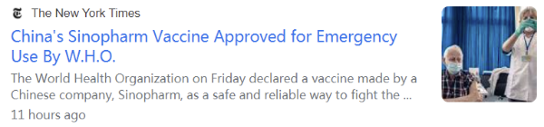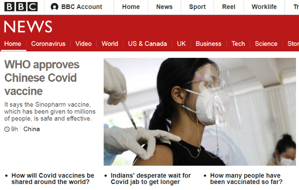 英國(guó)廣播公司(BBC)報(bào)道稱,世界衛(wèi)生組織周五表示,它已驗(yàn)證了國(guó)藥疫苗的“安全性、有效性和質(zhì)量”。這是第一款得到世衛(wèi)組織支持的非西方國(guó)家研制的新冠疫苗。中國(guó)和其他一些國(guó)家已經(jīng)有數(shù)千萬(wàn)人接種了國(guó)藥疫苗。