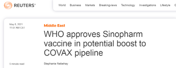 英國(guó)路透社報(bào)道認(rèn)為,世界衛(wèi)生組織周五批準(zhǔn)中國(guó)國(guó)有制藥企業(yè)國(guó)藥集團(tuán)生產(chǎn)的新型冠狀病毒疫苗可用于緊急使用,這將推動(dòng)中國(guó)在全球新冠疫苗接種方面發(fā)揮重要作用。