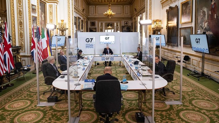 △七國(guó)集團(tuán)外長(zhǎng)會(huì)帶有透明隔斷的會(huì)議現(xiàn)場(chǎng)