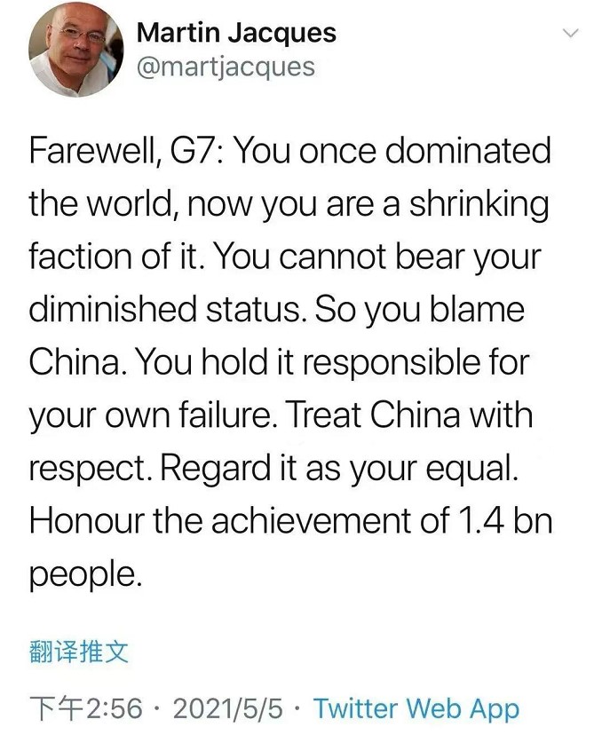 馬丁·雅克表示,“再見(jiàn)了,七國(guó)集團(tuán)!曾經(jīng)統(tǒng)治世界,但現(xiàn)在影響力江河日下。不滿現(xiàn)在的衰頹,你們就去指責(zé)中國(guó),你們應(yīng)該為自身的失敗負(fù)責(zé)!對(duì)待中國(guó)要放尊重些,彼此之間要平等相待。對(duì)待十四億中國(guó)人取得的成就更要放尊重些!”