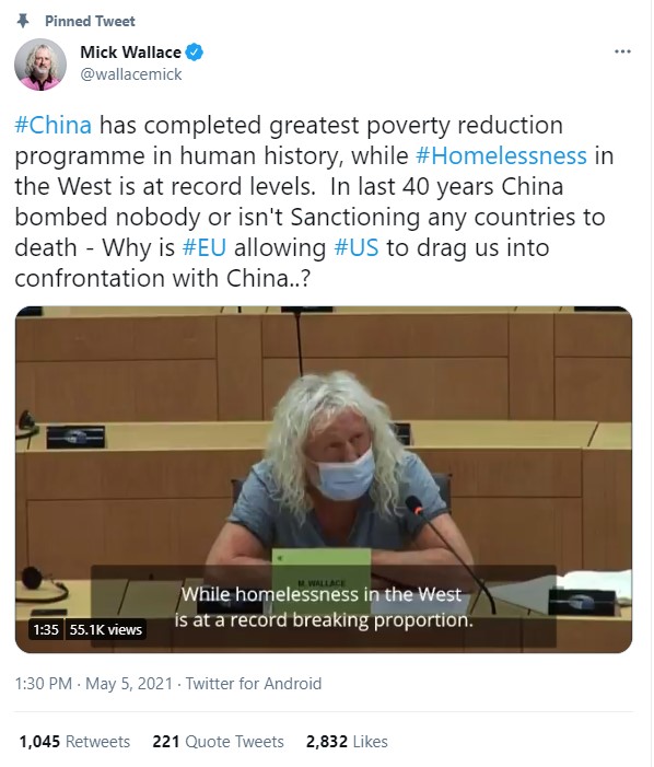 歐洲議會(huì)議員米克·華萊士(Mick Wallace)5月5日在議會(huì)發(fā)言時(shí)深入分析了中國(guó)“從來(lái)不侵略、從來(lái)不轟炸、從來(lái)不制裁別國(guó)”的和平發(fā)展歷程,痛斥了西方的劣勢(shì)發(fā)展基礎(chǔ)。