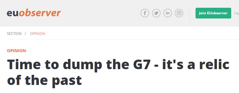 在G7外長(zhǎng)會(huì)召開(kāi)前夕,歐洲媒體《歐盟觀察者》(EU Observer)在其網(wǎng)站刊發(fā)評(píng)論文章《是時(shí)候拋棄G7了,它是歷史遺物》。