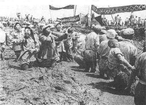 1952年汛前搶建荊江分洪工程。圖為清淤現(xiàn)場(chǎng)。(資料圖片,荊江分洪工程南北閘管理處提供)