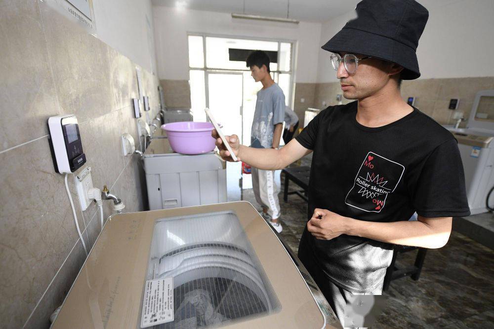 ↑ 寧夏建設(shè)職業(yè)技術(shù)學(xué)院學(xué)生在洗衣房通過APP掃碼進(jìn)行計(jì)量式用水(5月12日攝)。