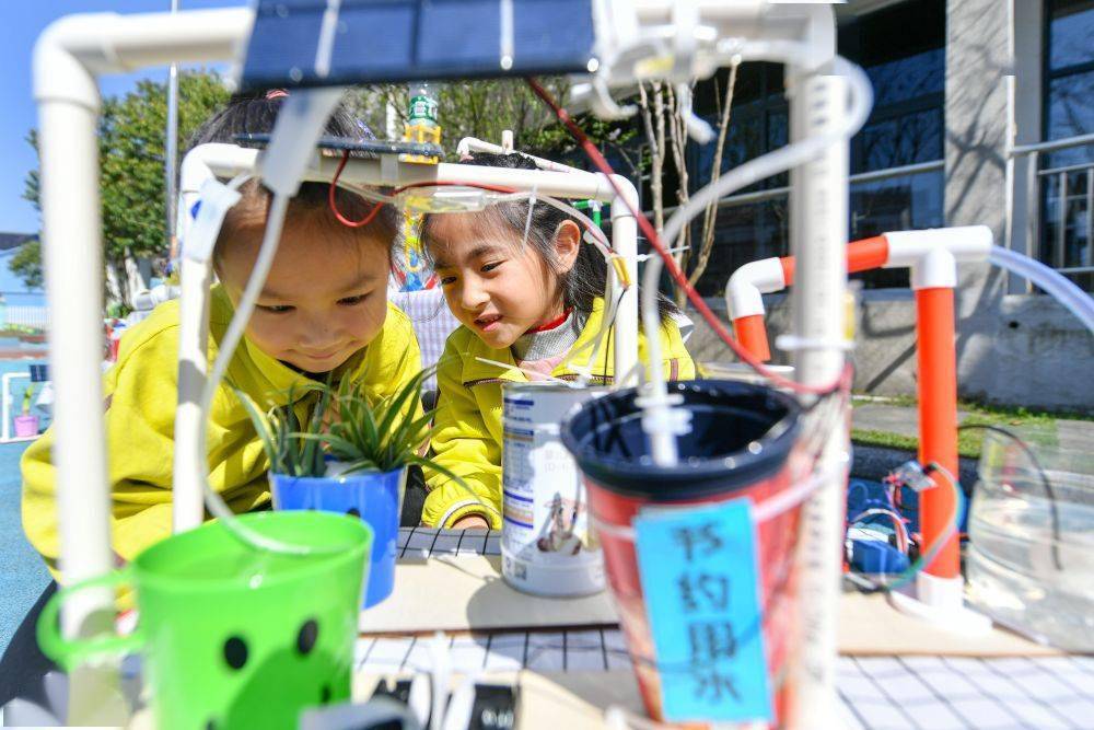 ↑3月22日,浙江省湖州市長興縣泗安鎮(zhèn)中心幼兒園的孩子們體驗(yàn)節(jié)水環(huán)?萍夹“l(fā)明。
