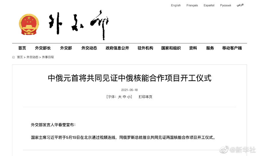 外交部發(fā)言人華春瑩5月18日宣布:國家主席習(xí)近平將于5月19日在北京通過視頻連線,同俄羅斯總統(tǒng)普京共同見證兩國核能合作項(xiàng)目開工儀式。