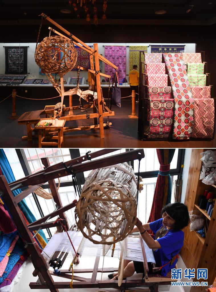 拼版照片:上圖為廣西民族博物館展示的織錦機(jī)(5月18日攝);下圖為中國工藝美術(shù)大師譚湘光在用織錦機(jī)織壯錦(2018年4月24日攝)。