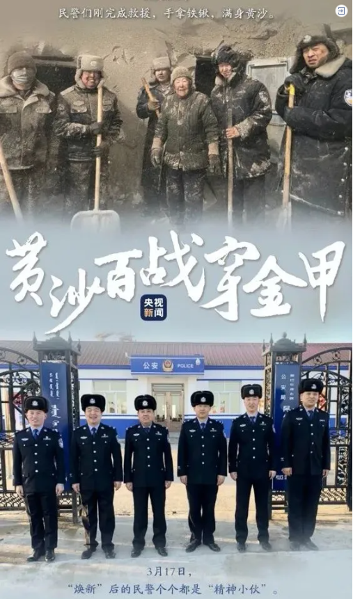 3月15日內(nèi)蒙古呼倫貝爾市遭遇暴風(fēng)雪和沙塵暴一位老人被困家中民警用鐵鍬、手推車清理積雪經(jīng)過兩個(gè)多小時(shí)不間斷“作戰(zhàn)”終于把老人救了出來而那時(shí),他們身上已布滿沙土變成了一座座活的“雕塑”這張沒有濾鏡的合影