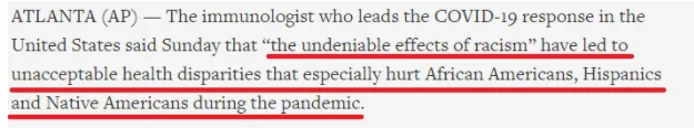 福奇:“疫情暴露了我們社會的失敗之處,所有與健康相關(guān)的決定性社會因素都與少數(shù)族裔面臨的不利條件相關(guān)聯(lián)。一些少數(shù)族裔民眾發(fā)現(xiàn),他們從出生起,就在獲得充足食物、醫(yī)療保健方面處于不利地位,而這些因素與我們社會中不可否認的種族主義影響密切相關(guān)!