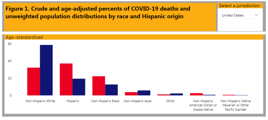 △CDC調(diào)查顯示,拉丁裔、非洲裔和原住民死于新冠肺炎的比例(紅柱)遠高于這些族群在美國總?cè)丝谥兴急壤ㄋ{柱)。