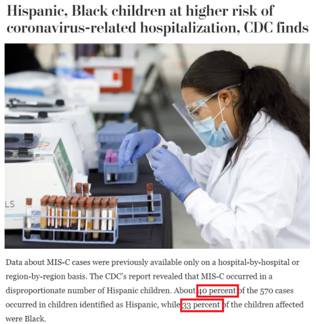 此外,新冠肺炎導(dǎo)致的嚴重并發(fā)癥也更常見于少數(shù)族裔兒童,超過70%的兒童多系統(tǒng)炎癥綜合征(MIS-C)報告病例發(fā)生在拉丁裔和非洲裔兒童中。