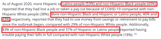 調(diào)查顯示,截至去年8月美國第二波疫情全面暴發(fā),失業(yè)或被減薪的非洲裔和拉丁裔美國人分別占到本族群的43%和53%;被迫動用儲蓄或退休金維持生計的非洲裔和拉丁裔美國人分別占40%和43%;在全額支付賬單時遇到困難的非洲裔和拉丁裔美國人分別占43%和37%。所有這些比例均明顯高于白人。