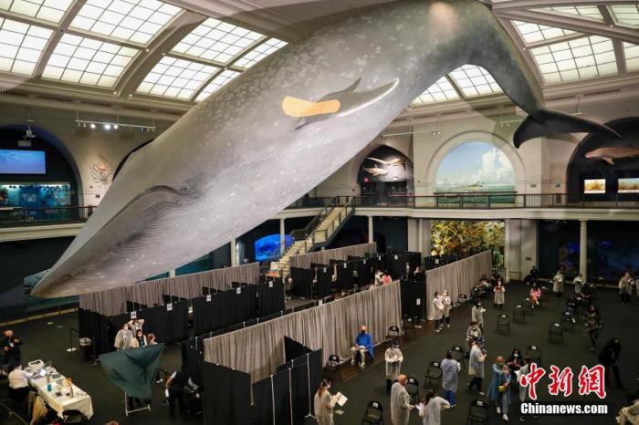 資料圖:當(dāng)?shù)貢r(shí)間4月23日,位于紐約的美國(guó)自然歷史博物館開(kāi)辟米爾斯坦海洋生物大廳為新冠疫苗接種點(diǎn),為18歲以上的紐約居民接種新冠疫苗。 中新社記者 廖攀 攝