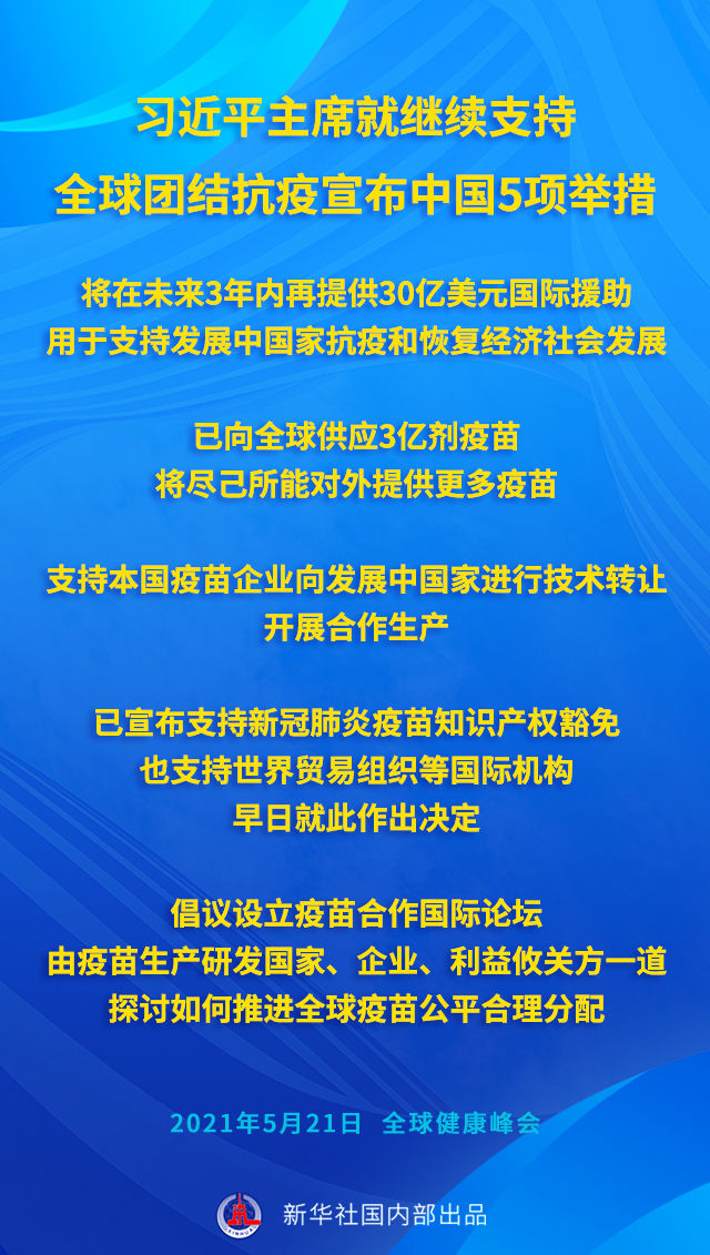 2021年5月,面對(duì)全球疫情的起伏反復(fù),著眼全人類(lèi)共同需求,習(xí)近平主席在全球健康峰會(huì)上又提出5點(diǎn)意見(jiàn)、宣布5項(xiàng)新舉措。