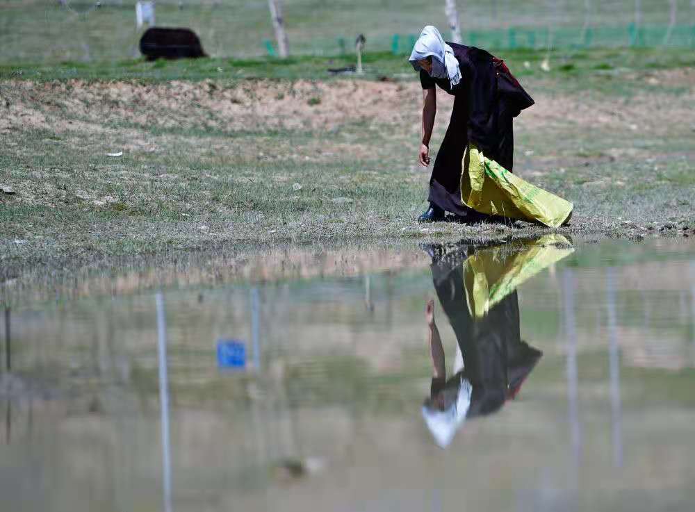 ▲ 2020年8月19日,在青海省果洛藏族自治州瑪多縣瑪查理鎮(zhèn)噶丹村,生態(tài)管護(hù)員才讓卓瑪在村子周邊的草原上撿垃圾。