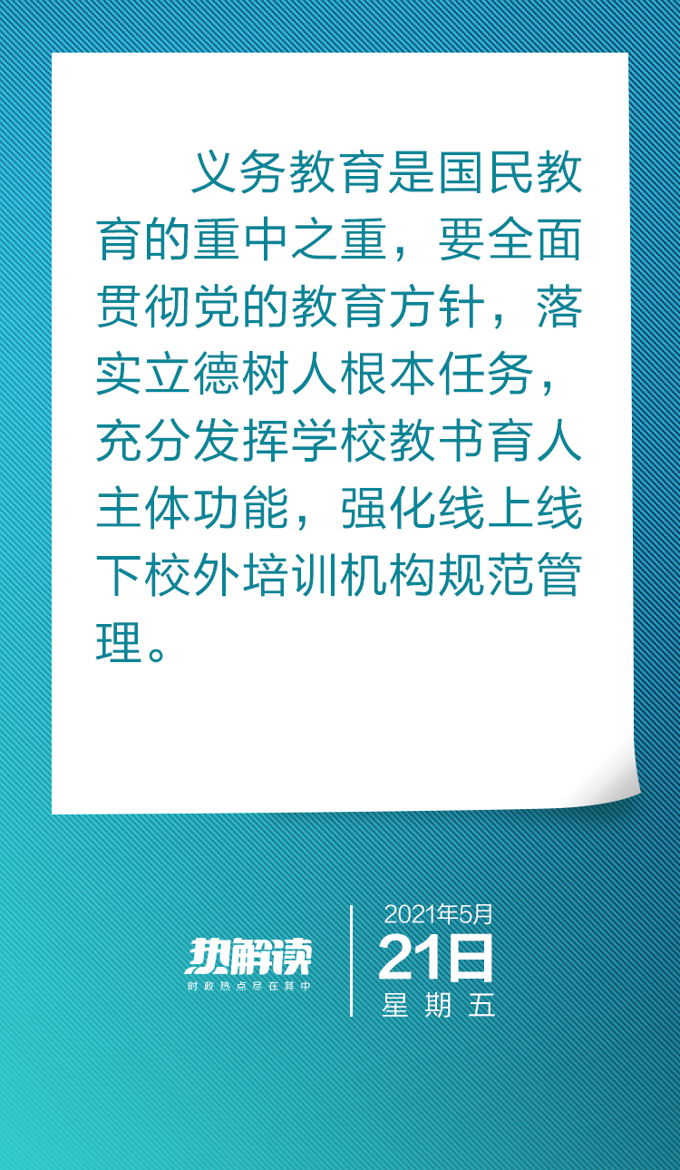 習近平總書記在會議上明確指出,義務教育是國民教育的重中之重,要全面貫徹黨的教育方針,落實立德樹人根本任務,充分發(fā)揮學校教書育人主體功能,強化線上線下校外培訓機構規(guī)范管理。