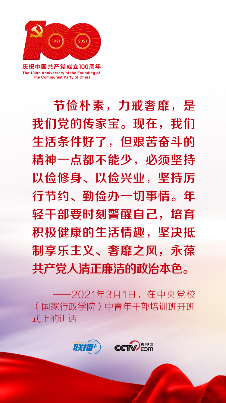 今年是中國共產(chǎn)黨成立100周年。央視網(wǎng)《聯(lián)播+》欄目特梳理習(xí)近平總書記關(guān)于艱苦奮斗、勤儉節(jié)約的重要論述,與您一起學(xué)習(xí)。
