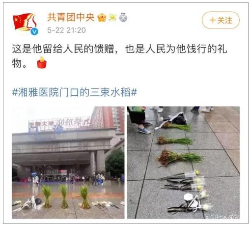 據(jù)瀟湘晨報(bào)報(bào)道,在花束中間,還有市民送來(lái)三“束”水稻苗,水稻挺立在醫(yī)院門(mén)口,寄托著一種別樣的哀思。