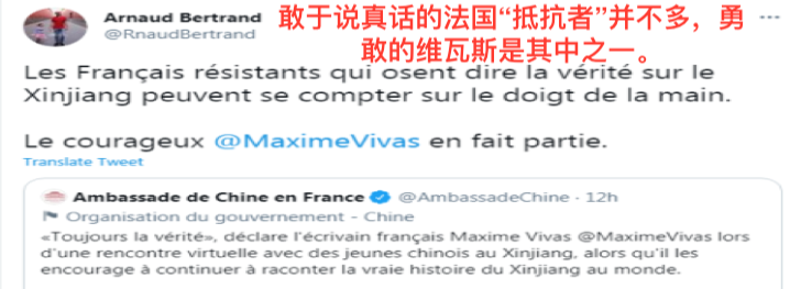 有網(wǎng)友轉(zhuǎn)發(fā)中國駐法國大使館推文并評論說:敢于說真話的法國“抵抗者”并不多,勇敢的維瓦斯是其中之一。