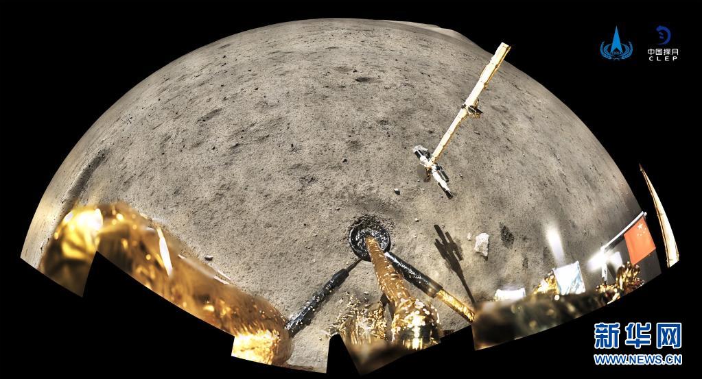 2020年12月4日,國家航天局公布了探月工程嫦娥五號(hào)探測器在月球表面國旗展示的照片。嫦娥五號(hào)著陸器和上升器組合體全景相機(jī)環(huán)拍成像,五星紅旗在月面成功展開,此外圖像上方可見已完成表取采樣的機(jī)械臂及采樣器。新華社發(fā)(國家航天局供圖)